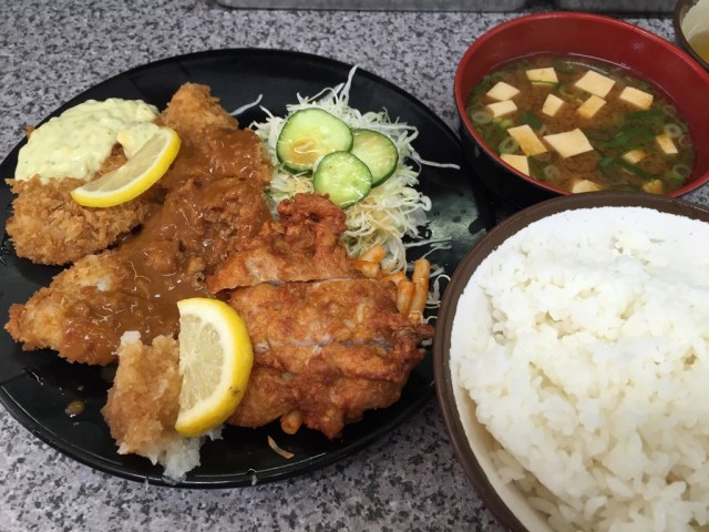 3種類もフライがつき、美味しい赤だし味噌汁付きで590円。安すぎる。