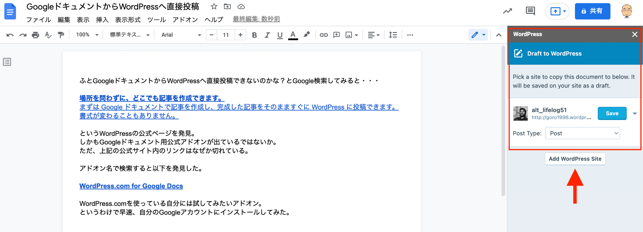 「WordPress.com for Google Docs 」のOpenを選択すると、Googleドキュメントの右側に「Draft to WordPress」というウインドウが開いた。
