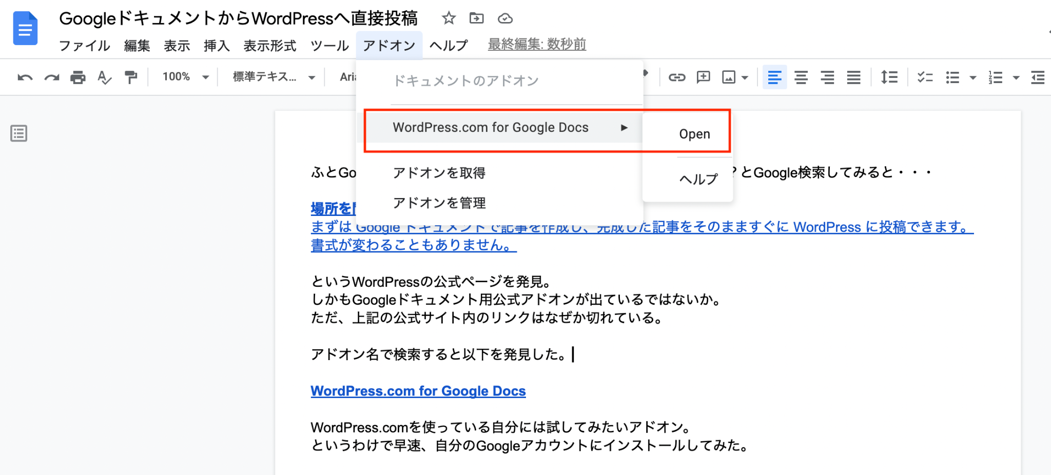 そして、Googleドキュメントで適当に文章打って、アドオンメニューを選択すると、「WordPress.com for Google Docs 」があった。