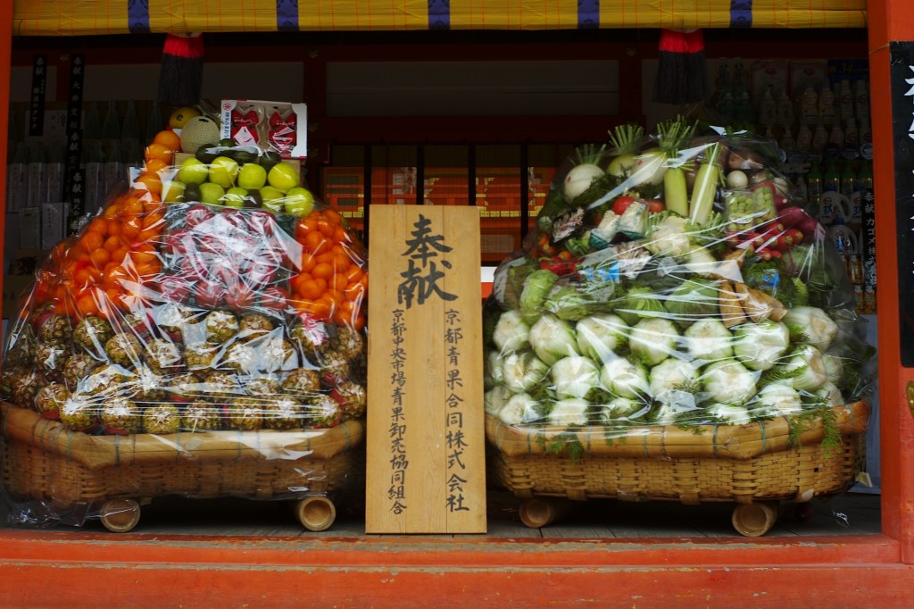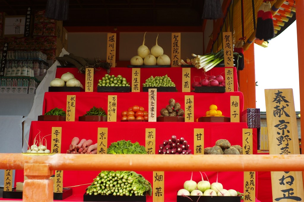 本殿の前に初午大祭に合わせて奉納された農作物、日本酒、醤油など調味料がうずたかく積み上がっており、圧巻だった。