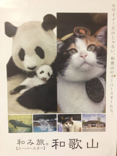 JRに貼ってあった和歌山市に観光客を呼び込むポスター。三毛猫駅長とパンダがいる動物園がどういった位置関係か分からないけど、おーっと足を止めてしまう人は多いだろう。経験を提案するという意味ではインパクトがある。