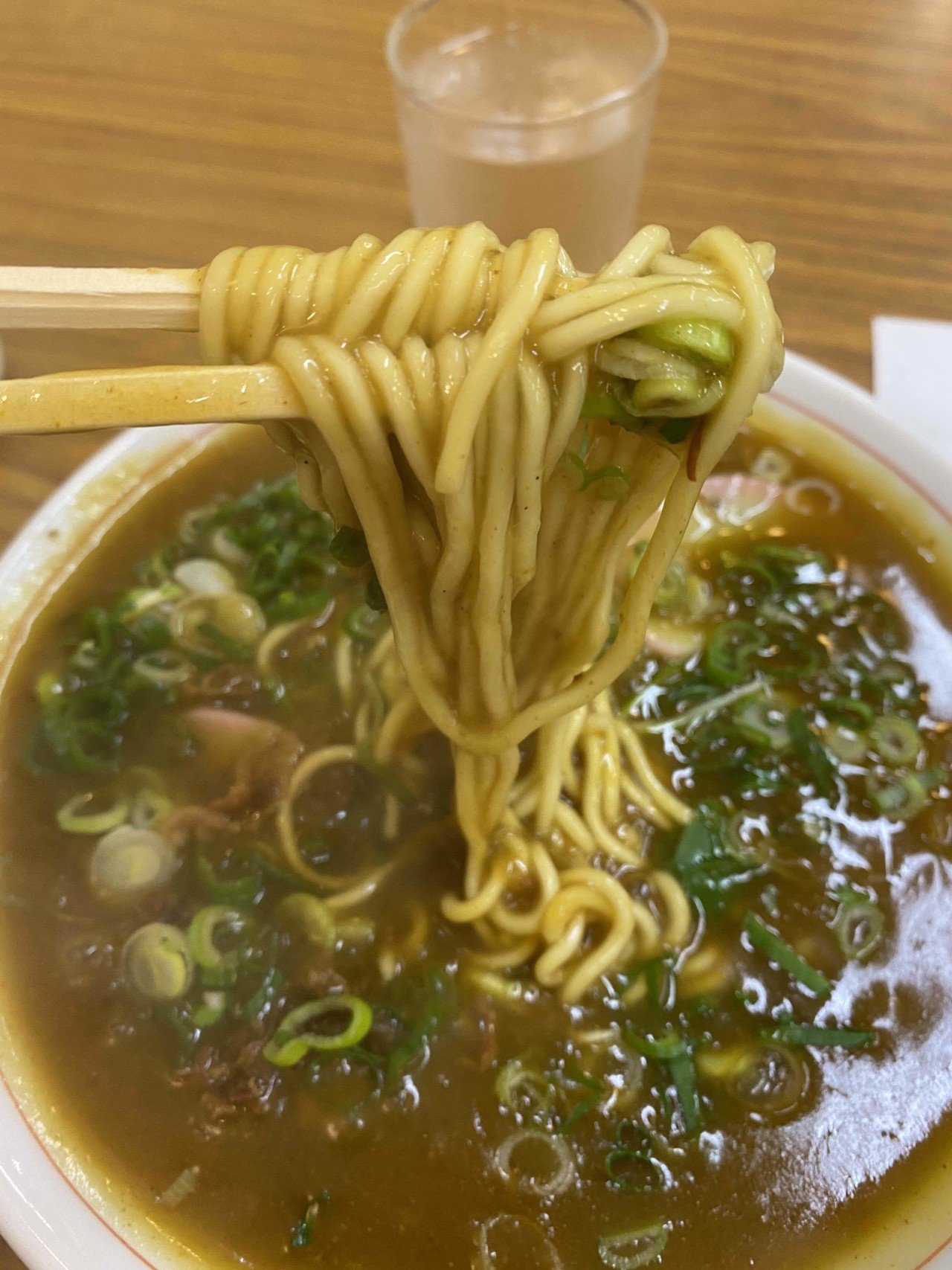 麺を持ち上げると、黄色い中華麺が甘辛いカレーに絡んでる。